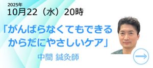 からだ博士講座 2025 #9 10月22日(水)20時 中間 善也 鍼灸師 「がんばらなくてもできるからだにやさしいケア」~日常に取り入れられる、意識を使ったシンプルなセルフケア~ 今回はオンライン(ZOOM)でのみ […]